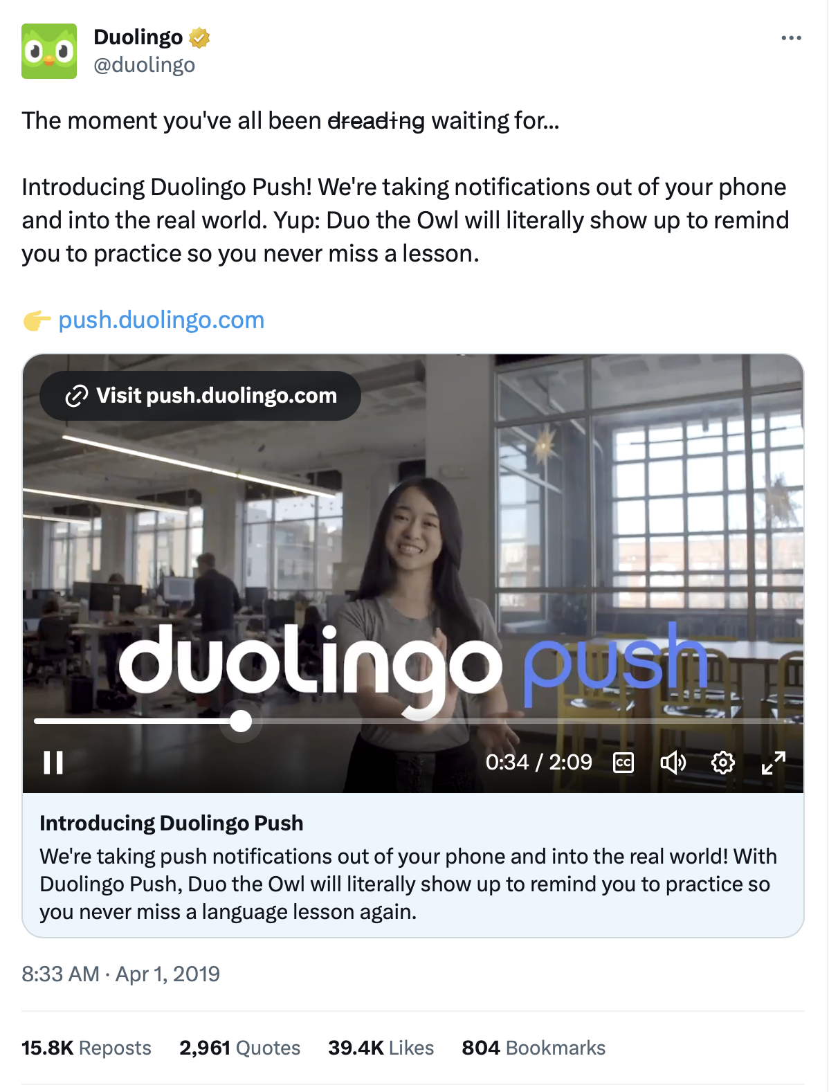 By both acknowledging the validity of criticisms, while at the same time, getting in on the action with a comedic take, the Duolingo Push video/campaign distilled the negativity with humor, in the process, endearing the brand with its critics.